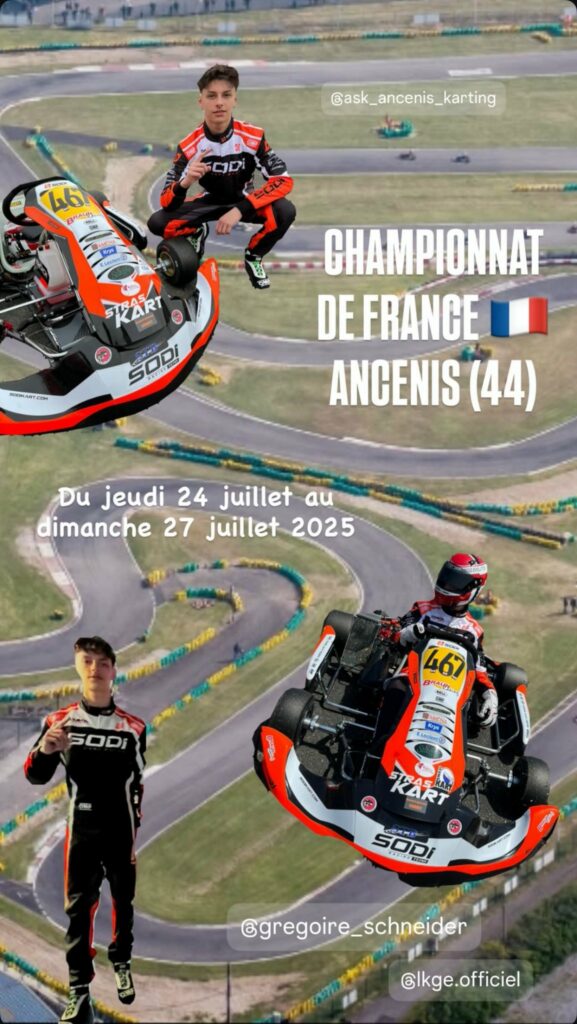 Sur le circuit IDEAL KART France à Mirecourt (88) Du jeudi 28 Aout au dimanche 31 Aout 2025 Compétition niveau national Au Chrono de 6 minutes il est 2ème sur 34 pilotes A la Manche 1 de 8 minutes + 1 tour il est 3ème sur 34 pilotes A la Manche 2 de 8 minutes + 1 tour il est 4ème sur 34 pilotes Au cumul avant super manche il est 4ème sur 34 pilotes A la Super Manche de 12 minutes + 1 tour il est 5ème sur 34 pilotes Au classement intermédiaire avant la finale il est 5ème sur 34 pilotes A la Finale de 16 minutes + 1 tour Grégoire termine 5ème sur 34 pilotes Surprise à venir avec un changement de catégorie dans les prochaines semaines pour Grégoire! Seniors, nous voilà! Grégoire est accompagné par l’Association GreggEvolution Vous souhaitez me soutenir? Contactez-moi! Nom & Prénom Email Message Envoyer FOLLOW ME!